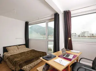 Au cœur de la ville de Grenoble et proche des Grandes Ecoles et des Universités (Grenoble INP, ESC, INP-Génie Industriel et IUT Grenoble II à moins d’un kilomètre), cette résidence vous propose des logements meublés avec salle de bain privative allant du studio au deux pièces. A proximité des transports (Gare SNCF et Tram A et B à quelques mètres) et des commerces (Vival, Carrefour), cette résidence est très calme et sécurisée. Parmi ses services inclus, vous pourrez bénéficier de l’internet illimité, d’un service d’accueil, d’un local à vélos, d’une salle de réunion ainsi que d’un service d’accès. Enfin pour compléter votre séjour, vous pourrez choisi parmi de nombreux services à la carte : laverie, parking, aspirateur, fer à repasser, distributeur, snack et service ménage.