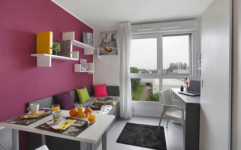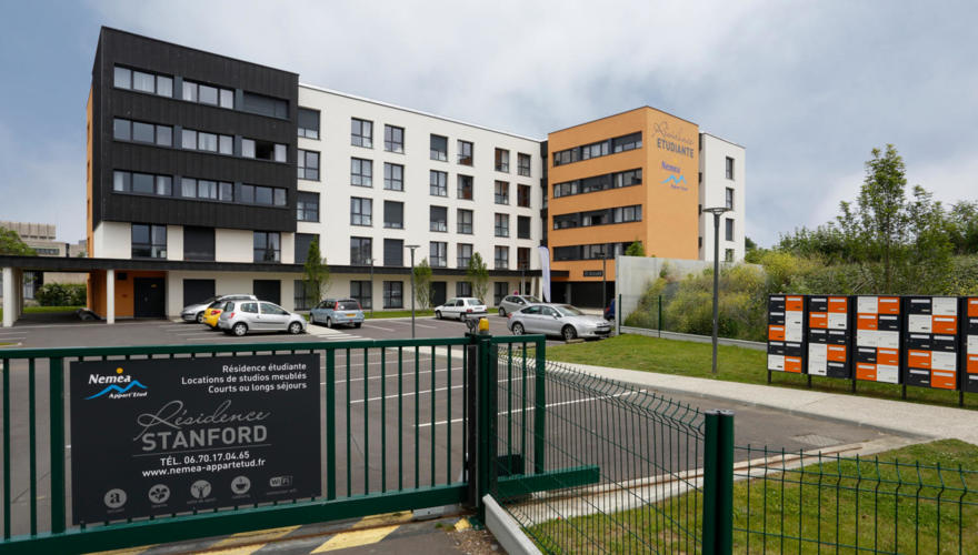 Located in the heart of the University of Caen, the residence Néméa Appart'Etud Stanford has many advantages to the success of your studies: in the immediate vicinity of campus 4 (Economy-Management) and campus 5 (Health) served by the tramway A (Claude Bloch stop) 10 minutes from campus 1 (Law-School of Human Languages), 12 minutes from downtown Caen and 6 minutes from campus 2 (Sciences - IUT). Less than 10 minutes walk from CC Côte de Nacre. The 150 practical and comfortable accommodations are composed of: a kitchenette equipped with storage, vitro-ceramic hob, microwave, refrigerator, bathroom with shower, toilet and towel radiator a living room with trundle bed, table, chairs, desk, wardrobe and wall shelves, TV and telephone socket. The residence also has common areas (gym, common room and laundry).