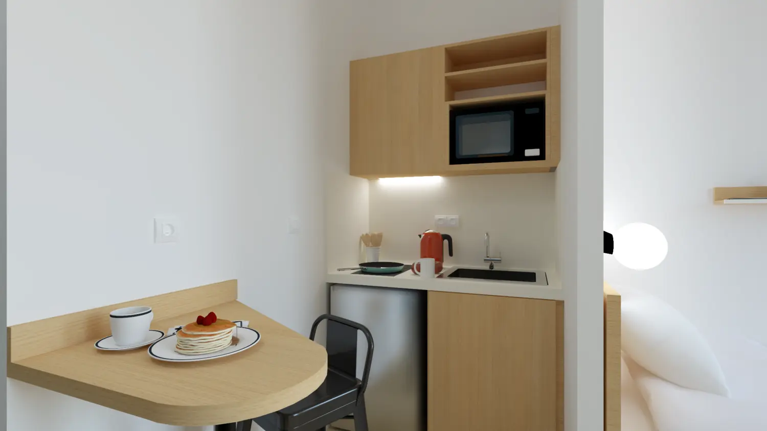 Each apartment is equipped with a kitchenette with a microwave, stovetop, and refrigerator, a bathroom with toilet, and a furnished living room/bedroom.