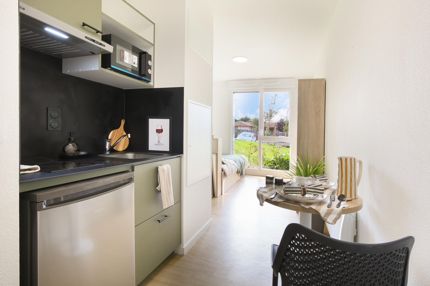 La residencia también ofrece una gama completa de servicios para simplificar la vida diaria: acceso seguro, lavandería conectada, servicio de limpieza, gimnasio. La parada de autobús T2 situada a los pies de la residencia permite llegar a la estación de tren de Tarbes en menos de 20 minutos, facilitando el desplazamiento.