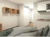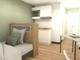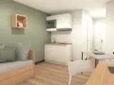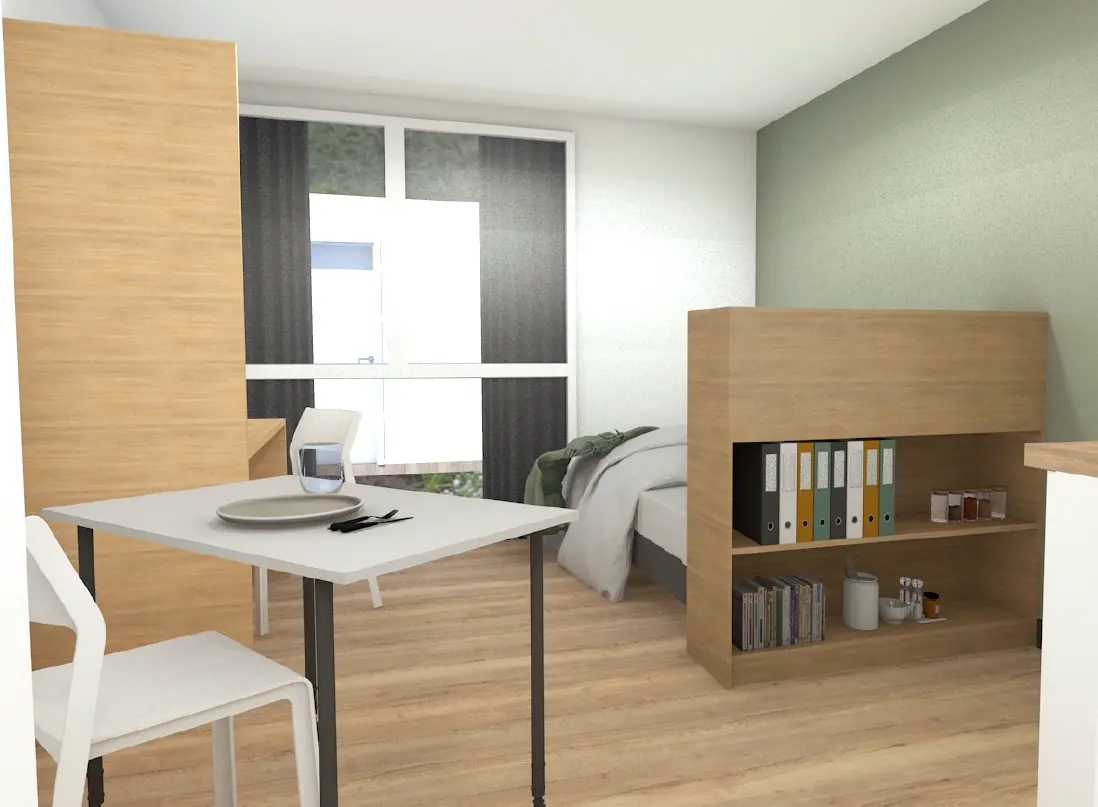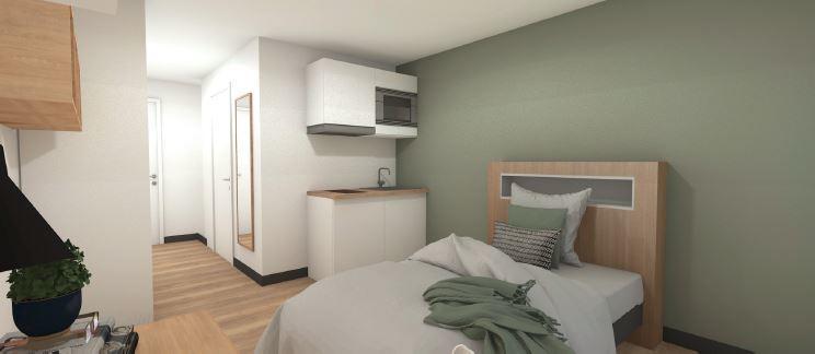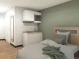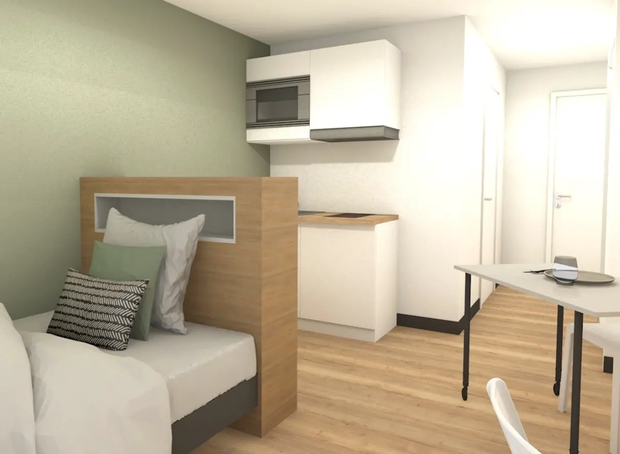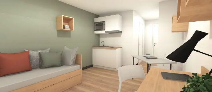 La résidence propose 102 logements, de 19m2 à 32m2, tous constitués d’une kitchenette équipée (rangements, plaque de cuisson électrique, four micro-ondes, réfrigérateur), une salle de bain avec douche et WC, une pièce à vivre avec lit gigogne, table, chaises, bureau et étagère murale et d’une prise TV.