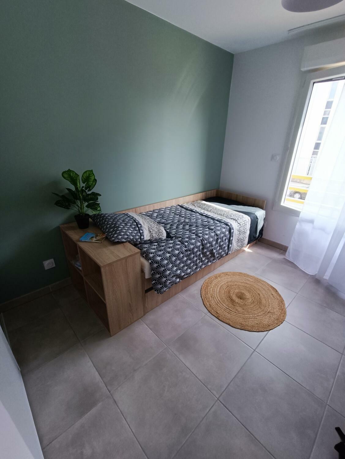 - d’une pièce à vivre avec lit gigogne, table, chaises, bureau et étagère murale