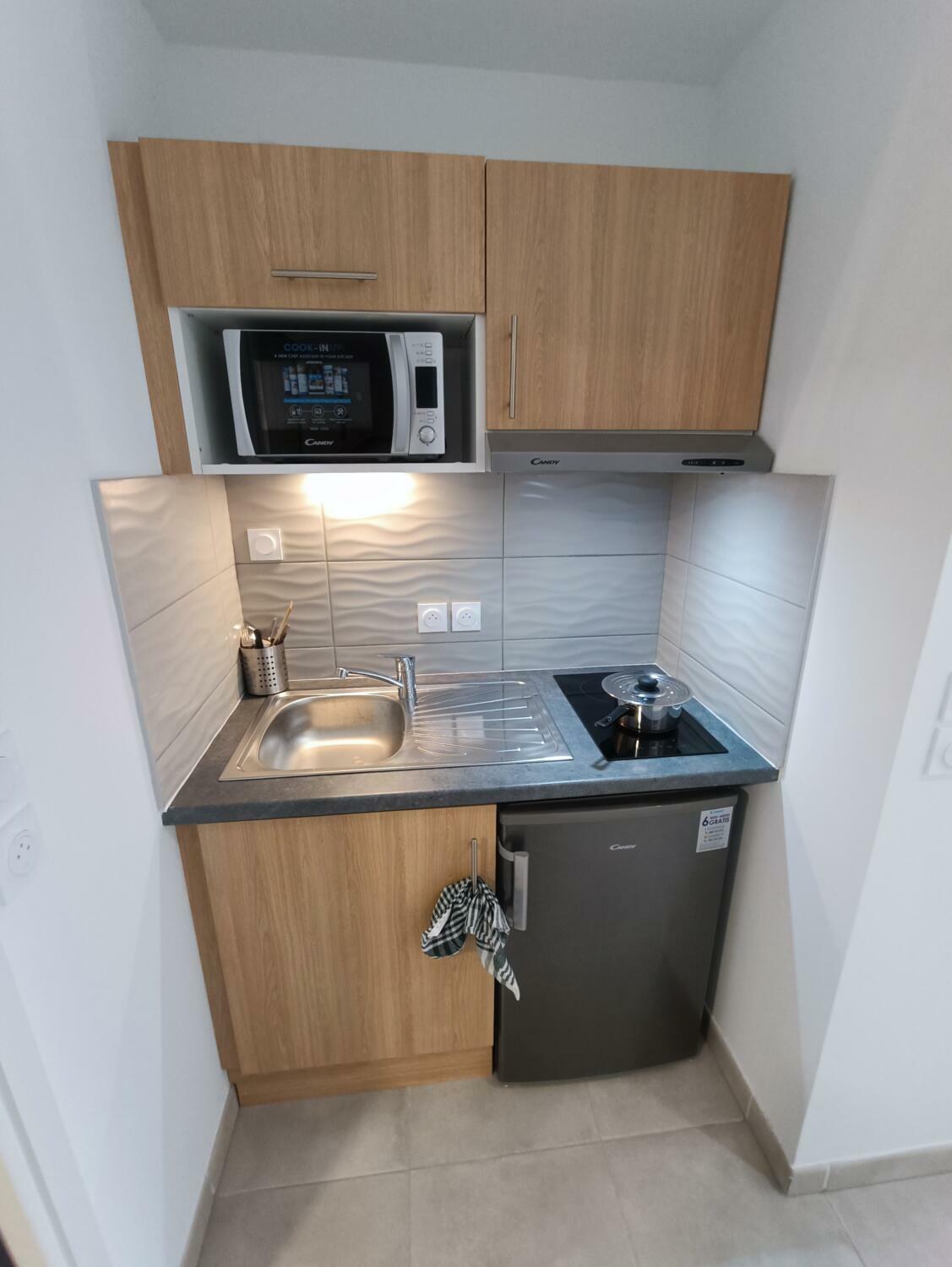 - d’une kitchenette équipée avec rangements, plaque de cuisson , four micro-ondes, réfrigérateur